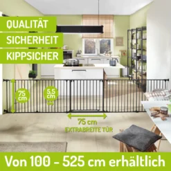 BOMI Kaminschutzgitter Milo 100-525 Cm | Extrabreite Tür: 75 Cm Durchgang & Feststellfunktion | Schutzgitter Für Kaminofen In Schwarz | Kaminschutzgitter Ohne Wandmontage | Kindergitter XXL