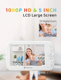 HeimVision Soothe 3 Video-Babyphone, HD 1080P, Nachtsicht, 5 Zoll Farbdisplay, 110 ° Weitwinkel, 2X Zoom, Temperatursensor, Gegensprechfunktion, Einschlaflieder, Reichweite Bis Zu 300m, Weiß